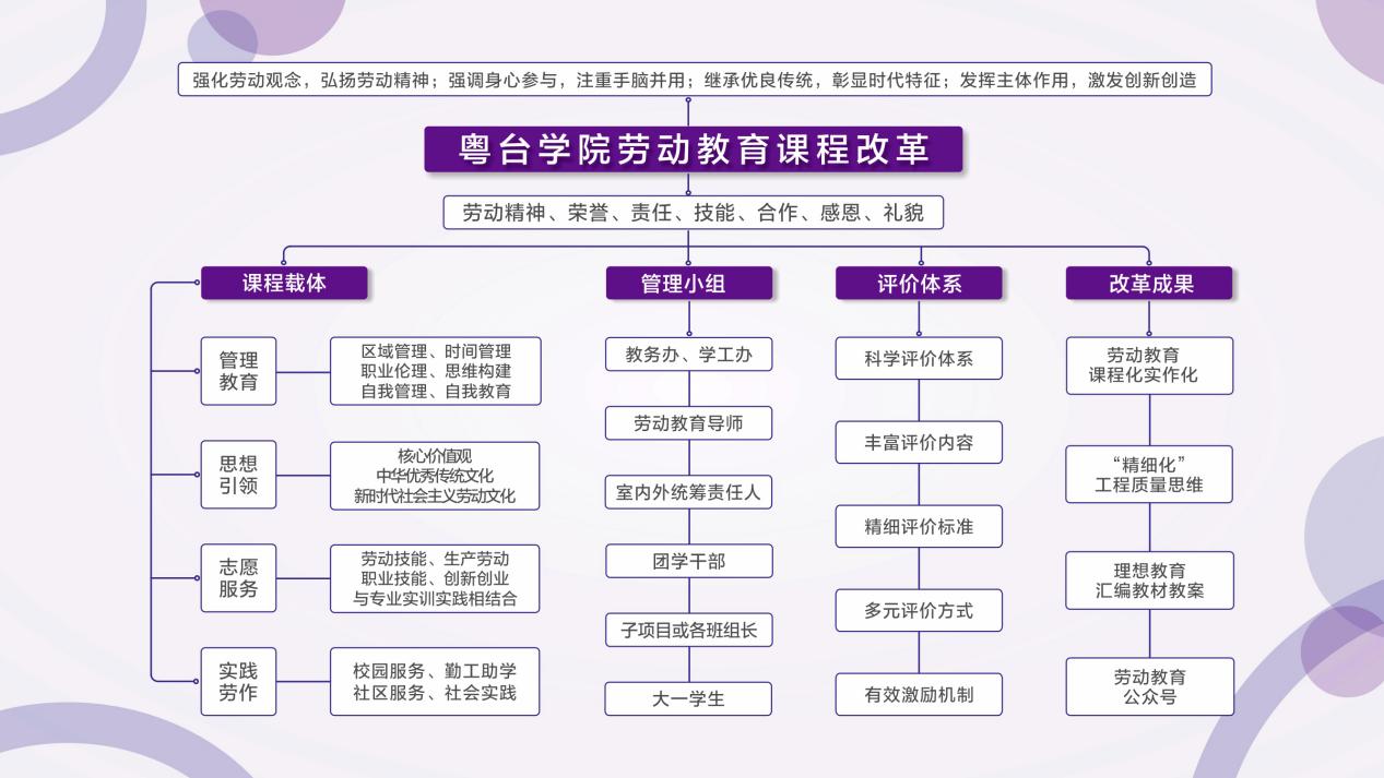 粤台产业科技学院以区域责任制劳动教育活动为重点,在大一新生中开展为期一学年的专项劳动教育实践课,结合大学四个学年劳动教育理论课(融入通识课、专业必修课等),大一至大三实行综合实践小学期以及大四的毕业实习环节等,促进劳动教育及其各项活动落到实处。