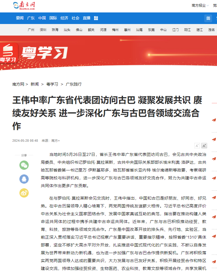 当地时间5月26日至27日,省长王伟中率广东省代表团访问古巴,会见古共中央政治局委员、中央组织书记罗伯托·莫拉莱斯,古共中央国际关系部部长埃米利奥·洛萨达,古共哈瓦那省委第一书记里万·伊斯基耶多,哈瓦那省省长亚内特·埃尔南德斯等政要,考察调研高等院校与科研机构,进一步深化广东与古巴各领域友好交流合作,努力为共建中古命运共同体作出更多广东贡献。