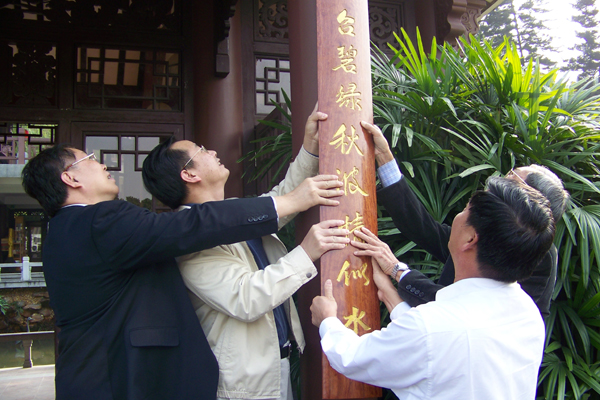 12月28日,在新的一年到来之际,原东莞市市长郑锦滔为人民公园新八景之一的“风篁煮茗”,送上了新春对联牌匾。我院党委书记周致纳、院长杨晓西以及莞城区党委书记王检养与老市长郑锦滔一起为“风篁煮茗”悬挂了对联。 郑锦滔老市长送上的对联牌匾是根据“风篁馆”有感而发而题写的,上联是“风入楼台碧绿秋波情似水”,下联是“篁龙驾雾腾空飞跃映云峰”,深刻描绘出了“风篁馆”那种碧波连天的江南意境。据悉,该对联牌匾选用了缅甸黄花梨树的木材,邀请雕刻名家花了三个多月的雕刻而成的。