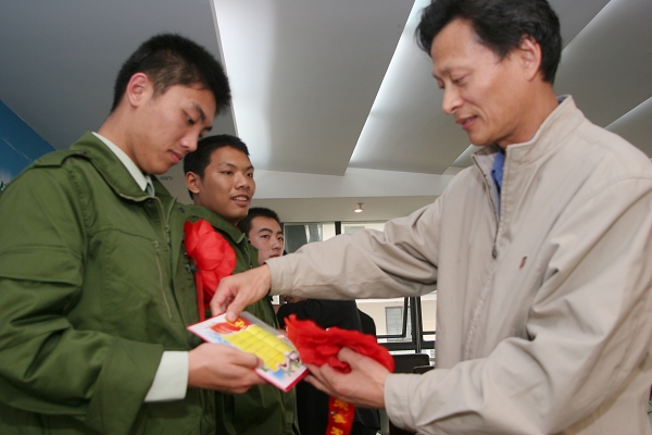 我院今年光荣入伍的6名在校学生今日踏上开往汕头的列车,即将为祖国戍守边防。昨日下午,学院召开座谈会,欢送入伍同学,副院长戴炳源和入伍同学、入伍同学家属、相关职能部门负责人参加了座谈会。