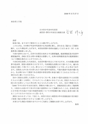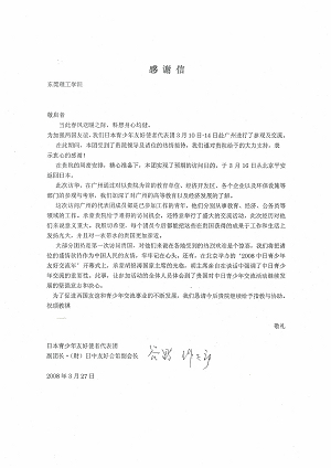 3月13日,日本青少年友好使者代表团一行130多人前来我院参观及交流,并在学生活动中心小剧场举行了一场中日青年联欢会。此次活动加深了中日两国青少年的相互理解,为构筑两国战略性互惠关系打下坚实基础。近日,日本青少年友好使者代表团副团长、前驻华大使谷野作太郎致函学院,对学院的热情接待及大力支持表示谢意。