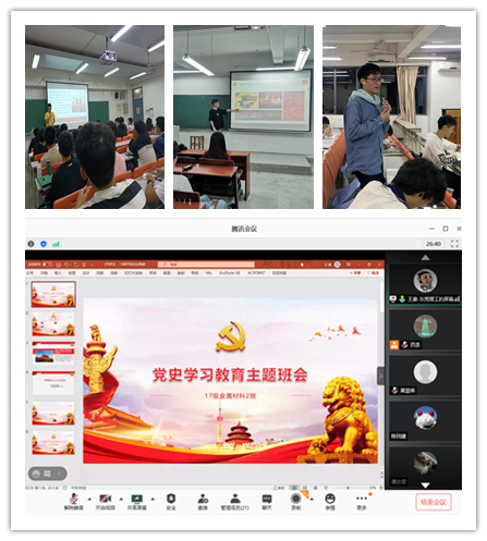 2020级网工1班的班会通过学习分享和观看爱国题材视频,学习了共产党的发展历程与经验总结,鼓舞大家坚定信念,不断前进。2020级杨振宁创新班的同学们以学习党史为契机,通过总结反思实现自我提升,进一步强化班级学风建设的重要性并做好新学期计划。