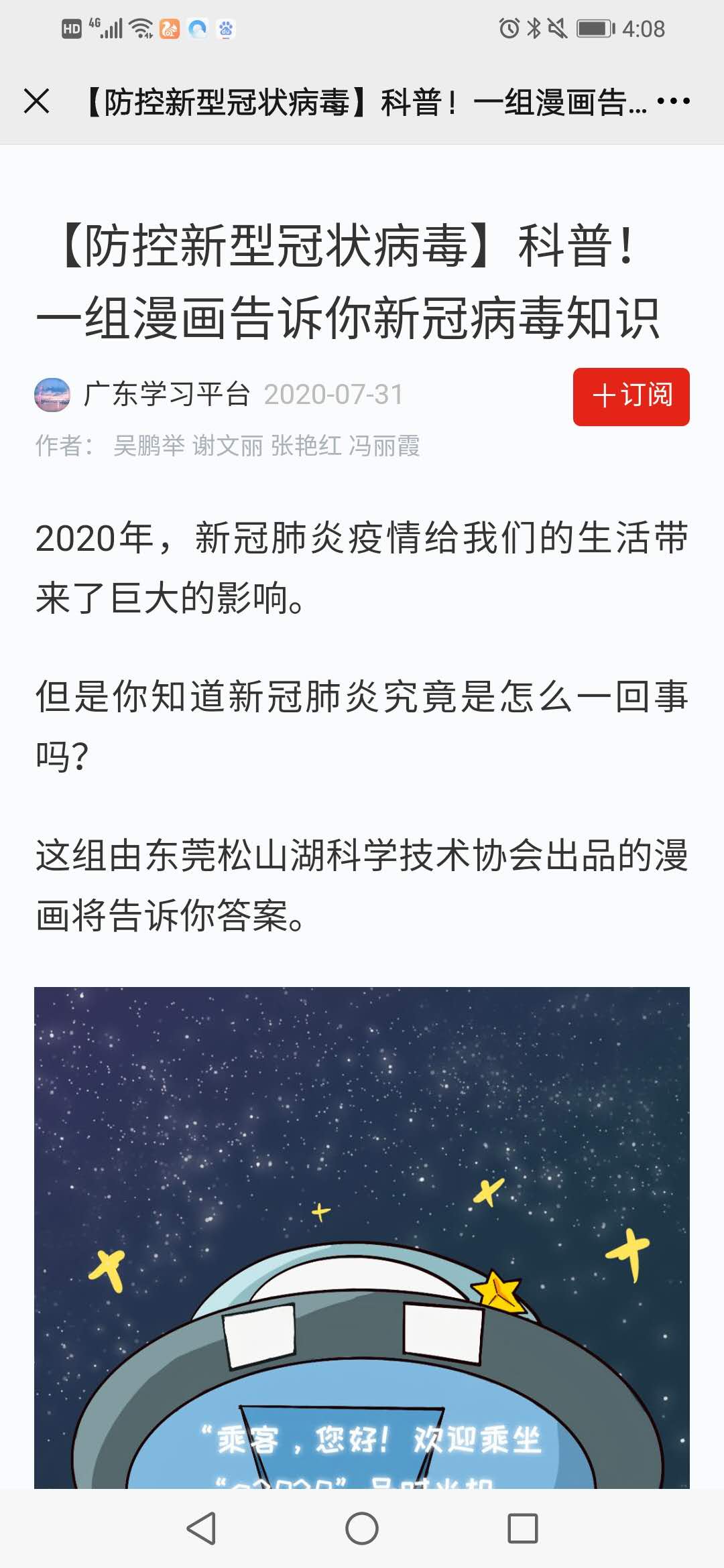 新冠病毒科普互动长漫作品经“幸福松山湖”公众号首发刊载,其后被南方日报、东莞时间网、阳光网和东莞十余个公众号转载,并被学习强国APP转载,总阅读量超过10万。