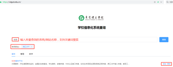 1、在网页端访问信息化系统查询平台(https://i.dgut.ddssm.com/)。平台具有开放接口,支持关键词检索,同时提供常用网站添加及查看更多相关信息的服务。